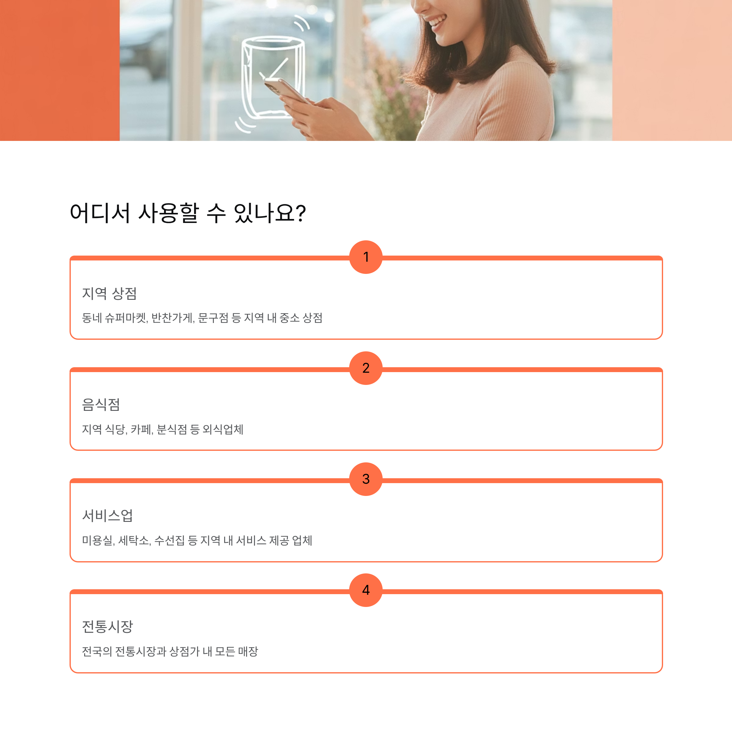 | 생활 서비스 | 세탁소, 동네 마트, 전통시장 | '사용 가능 매장' 스티커 확인 권장 |