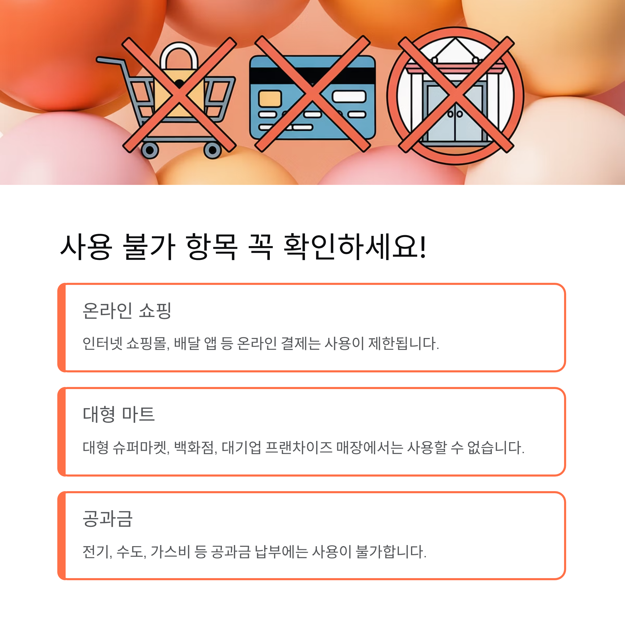 - 🚫 제한/불가 업종 존재: 대형마트, 백화점, 유흥업소 등 일부 업종에서는 사용이 제한되거나 불가능합니다. 사용 전 반드시 확인이 필요합니다.
