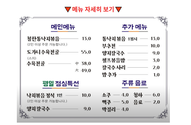 | 시그니처 메뉴 | 철판통낙지볶음, 수육전골 |