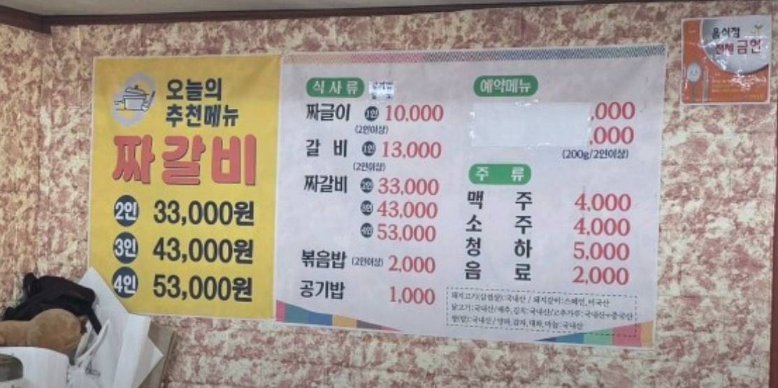 | 짜갈비 3인 | 43,000원 | 짜글이와 갈비를 함께 즐길 수 있는 세트 메뉴 (3인분). |