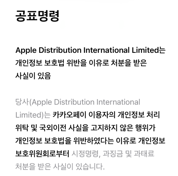 2025년 5월, 애플이 카카오페이 이용자 개인정보를 알리페이에 위탁·이전하면서 동의 및 고지를 제대로 하지 않아 정부로부터 과징금과 시정명령을 받았어요. 그 결과, 앱스토어와 공식홈페이지 등에서 '공표명령' 안내문을 띄우게 된 것이죠.