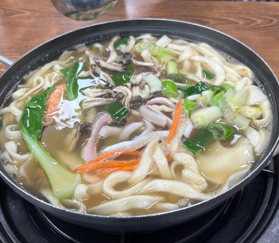 "해물찜이 아닌데 칼국수에 들어가는 커다란 해물들이 국물을 너무 시원하게 만들어요. 그냥 봤을 땐 평범한 칼국수 같은데 별로 맵지도 않을 것 같고, 근데 막상 먹어보면 깊은 맛이 나고 얼큰하거든요. 개운하고 일단 시원하고 깊어요."