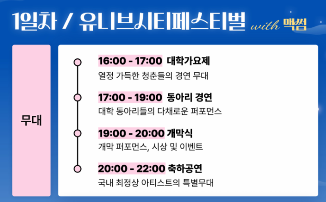 - 주요 볼거리: 대학가요제, 동아리 경연, 축하 공연, 체험 부스, 맥썸존, 가상 음주체험존