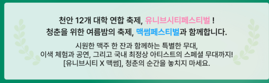 - 특징: 천안시와 12개 대학 연합 축제, 맥썸 페스티벌 연계