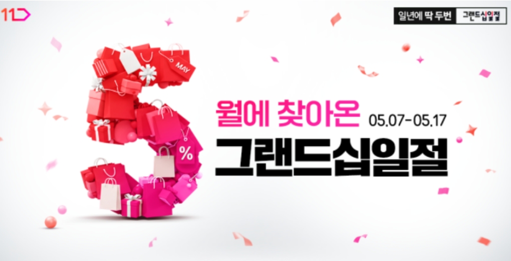 그랜드십일절 본행사는 5월 7일부터 17일까지 11일간 열립니다. 국내외 인기 브랜드와 협업한 카테고리별 특가전, 타임딜, 10분러시·60분러시 등 초특가 쇼핑 코너, 라이브방송, 각종 할인쿠폰, 고객 참여형 이벤트까지 모두 준비되어 있습니다. 알림 신청만 해도 추가 포인트, SKT 고객은 추가 혜택, 타임딜은 조기 품절 주의!