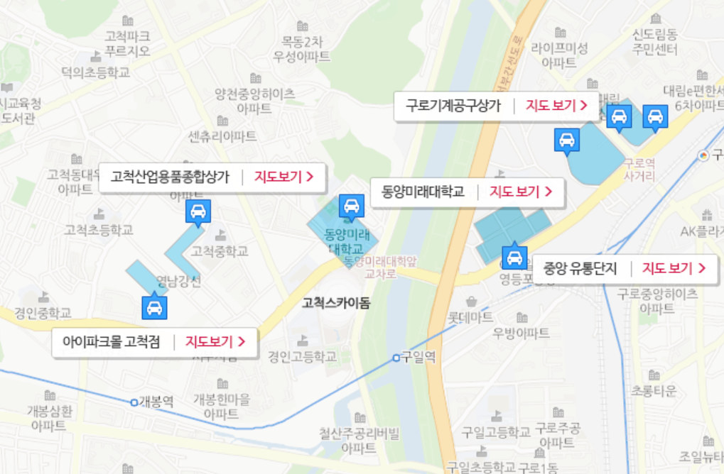 | AJ파크 고척스카이점 | 고척동 76-14 | 24시간/30분 3,000원 | 5분(350m) |