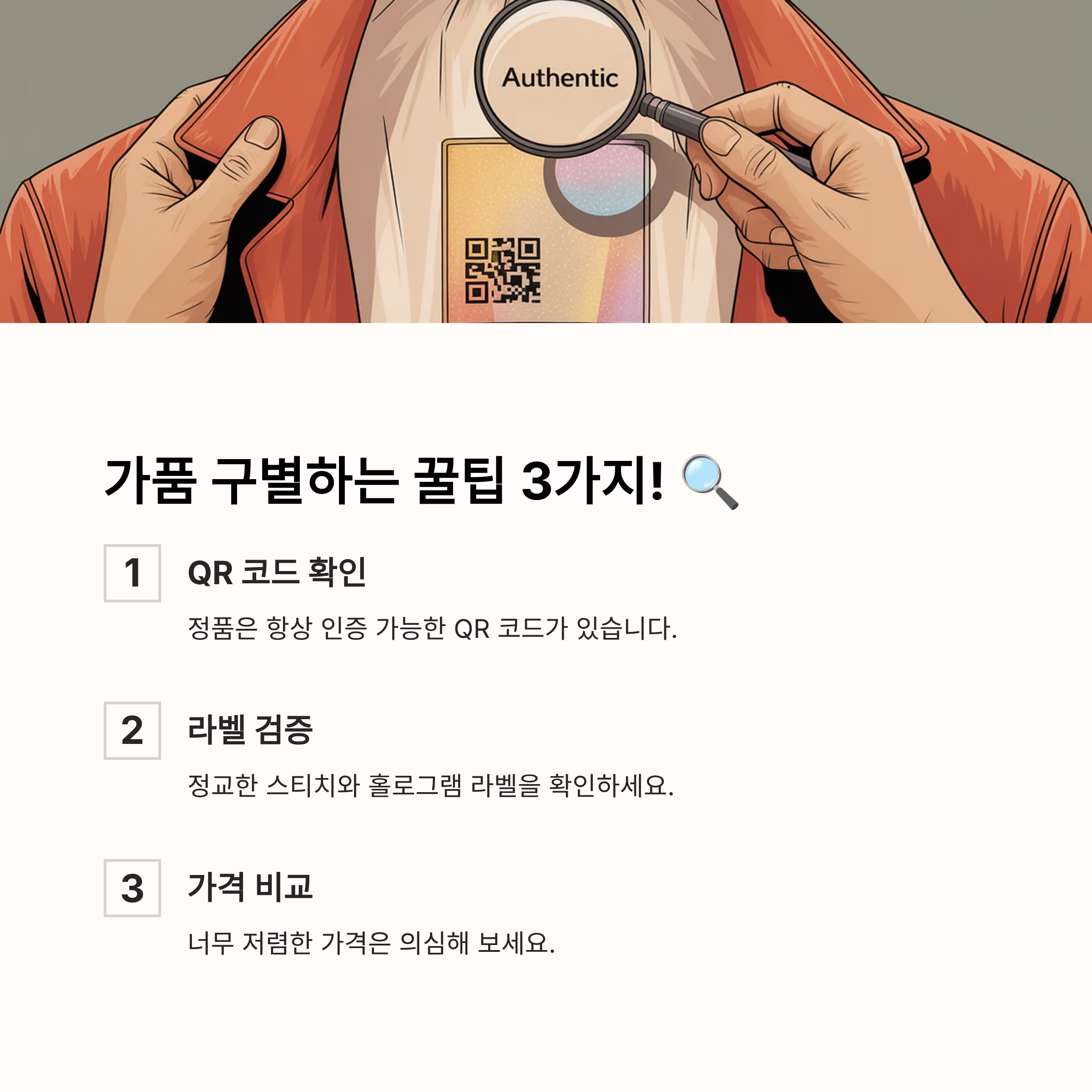 ✅ QR 코드와 홀로그램: 대부분의 정품에는 QR 코드나 홀로그램이 있어요. 꼭 스캔해서 확인하세요.