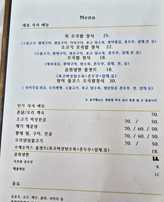 | 오곡밥정식 | 18,000원 | 오곡밥 + 제육볶음 + 된장찌개 + 나물류 |