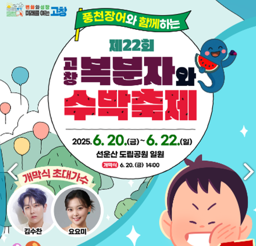 - 특징: 고창의 명품 복분자, 수박, 풍천장어를 맛보고 체험하는 여름 축제