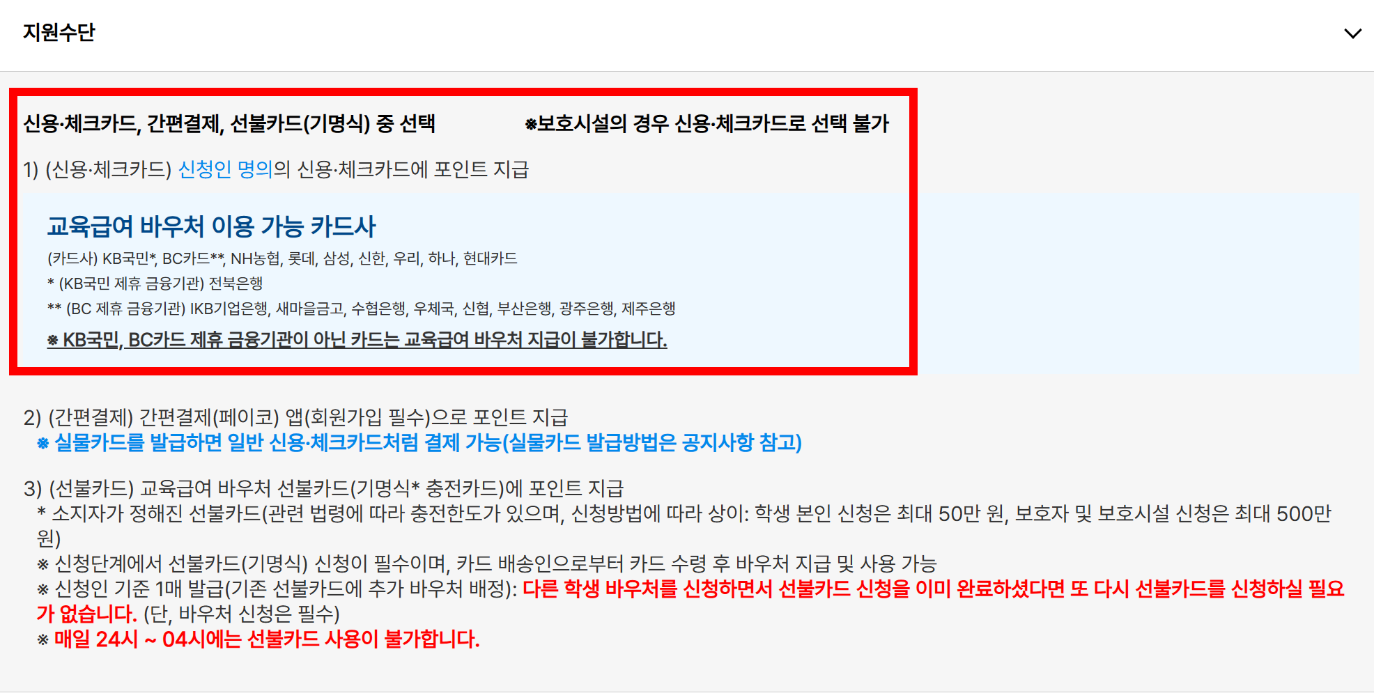 - 사용 방법: 교육급여 바우처 카드 또는 계좌 이체, 교육 관련 온/오프라인 가맹점에서 사용