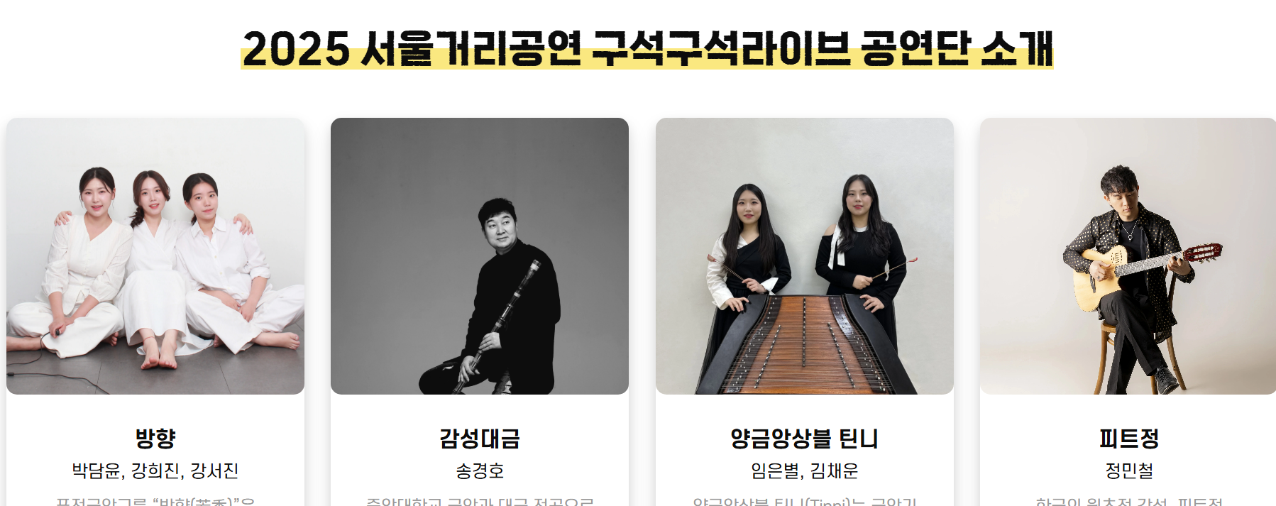 - 주요 프로그램: 전국 청소년/일반 시민 대상 버스킹 경연대회, 2025 서울거리공연단 특별 무대, 팬밋업 부스 (악기 체험, 캐리커처, 포토 부스)