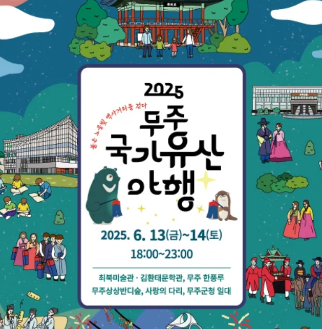 무주국가유산야행은 전라북도 무주군에서 열리는 특별한 야간 행사예요. 무주는 다양한 국가유산(문화유산, 무형유산, 자연유산)이 풍부하게 존재하는 지역인데요. 이 축제는 무주 지역에 위치한 문화시설과 연계해서 낮에는 미처 느끼지 못했던 국가유산의 가치와 의미를 몸소 이해하는 행사랍니다. [cite: 3] 한마디로 밤에 떠나는 특별한 역사 문화 탐험이라고 생각하시면 돼요!