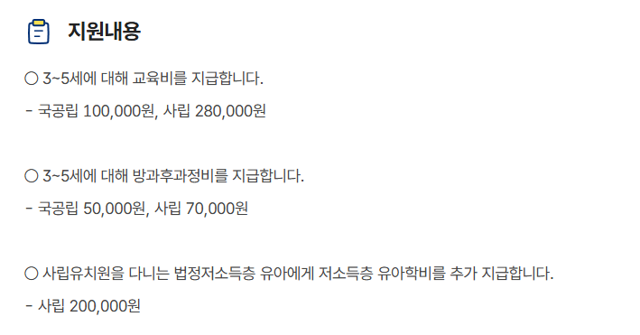 - 지원 금액: 국공립/사립 유치원 유형에 따라 차등 지원되며, 저소득층 추가 지원 있음.
