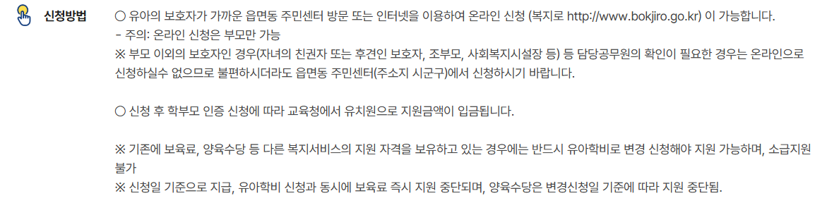 - 중요 유의사항: 사전신청 필수, 타 서비스(양육수당, 보육료)와 중복 불가, 국민행복카드 필요.