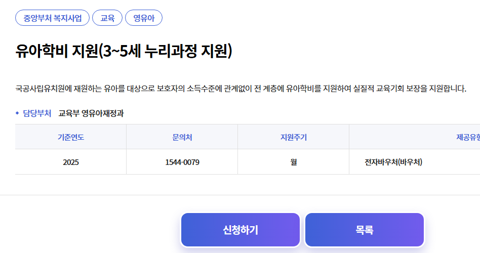 - 유아학비지원금 대상: 만 3세~5세 모든 유아 (소득 무관)