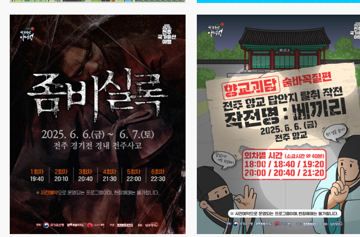 - 경기전 좀비실록: 좀비를 피해 조선왕조실록을 찾는 조선 판타지 프로그램! 이거 진짜 흥미진진할 것 같지 않나요?