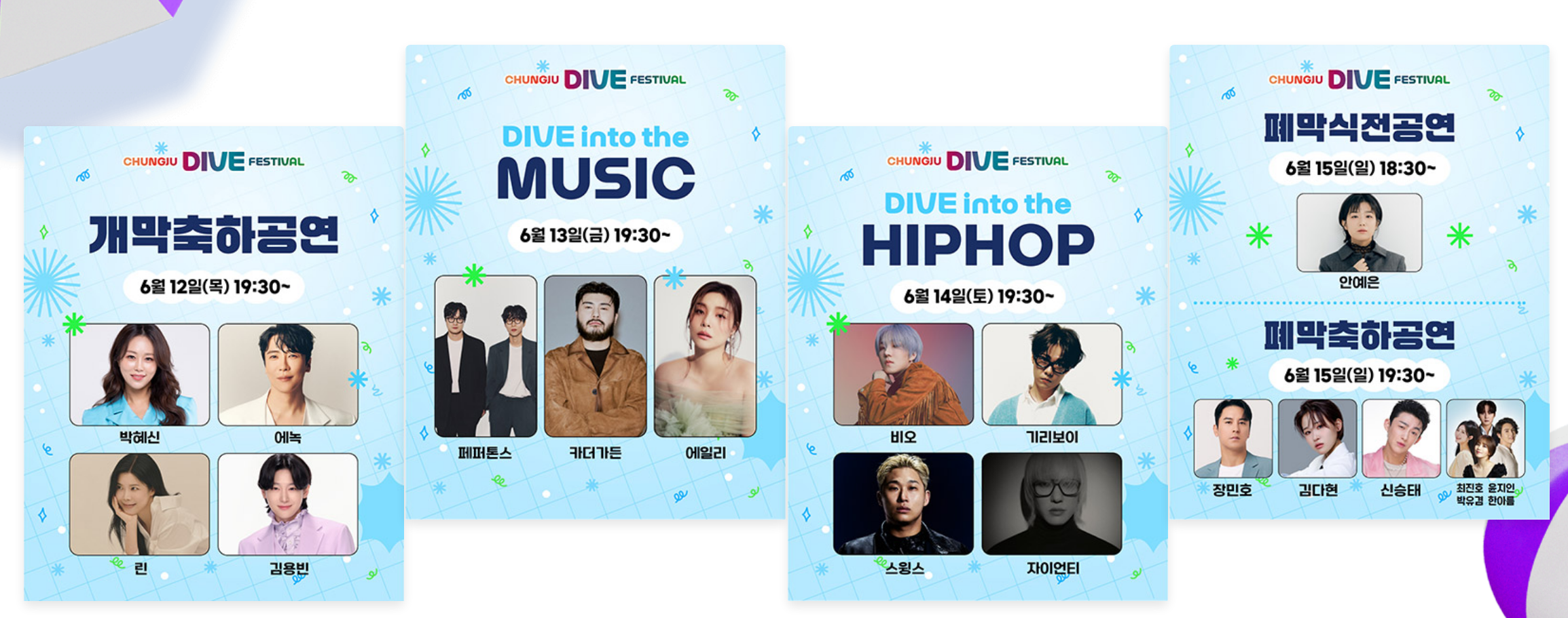 충주 다이브 페스티벌 2025: 충주의 매력에 '다이브'할 시간! 🌊🎶 6월, 충주 종합운동장에서 펼쳐지는 충주 다이브 페스티벌! K-POP, 락, 힙합 공연은 물론 열기구, 에어바운스까지! 다채로운 체험
