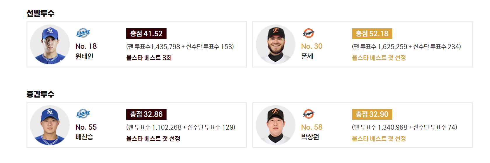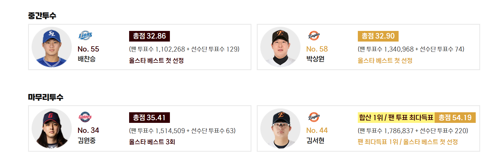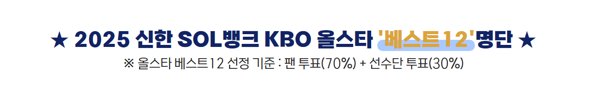 - 팬 투표 (70%): 온라인 투표를 통해 가장 많은 득표를 얻은 선수들이 베스트12에 선정됩니다.